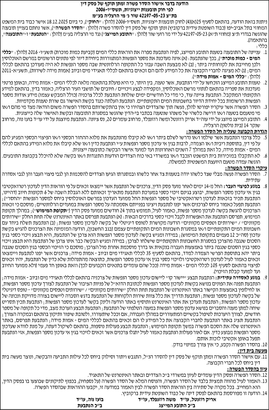 - הודעה בדבר אישור הסדר פשרה ומתן תוקף של פסק דין לפי חוק תובענות ייצוגיות, תשס"ו-2006 בת"צ 42197-05-23 שור נ' מי הרצליה בע״מ